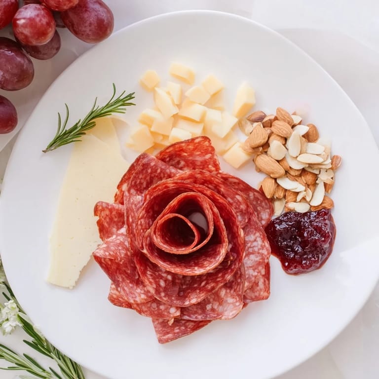 Pin A visually stunning single-serving charcuterie board featuring a beautiful salami rose, paired with cheeses, fruit, nuts, and accompaniments for a perfect appetizer or snack.