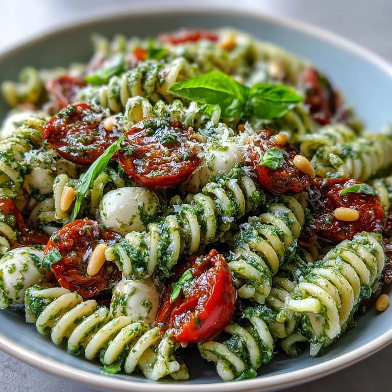 Timing is everything: prepping your pesto and ingredients while the pasta boils makes assembly fast. If you let the salad sit in the fridge, the flavors settle and the tomatoes mellow, but don't leave it too long—the greens can wilt.