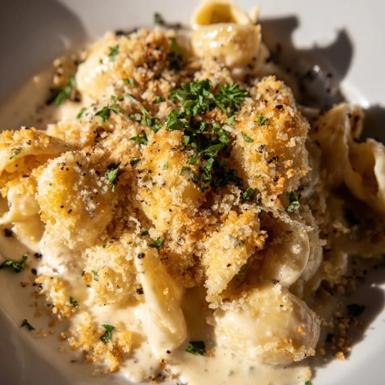 Panko breadcrumbs, melted butter, extra Parmesan, and fresh parsley create a crisp and flavorful golden crust.