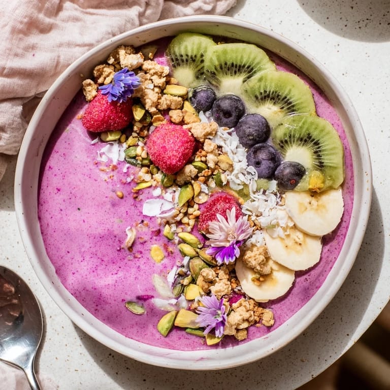 - Toppings: 1/4 cup fresh berries (blueberries, strawberries, or raspberries), 1 kiwi, peeled and sliced, 2 tbsp granola (gluten-free if needed), 1 tbsp chopped pistachios, 1 tbsp unsweetened coconut flakes, Edible flowers or microgreens (optional)
