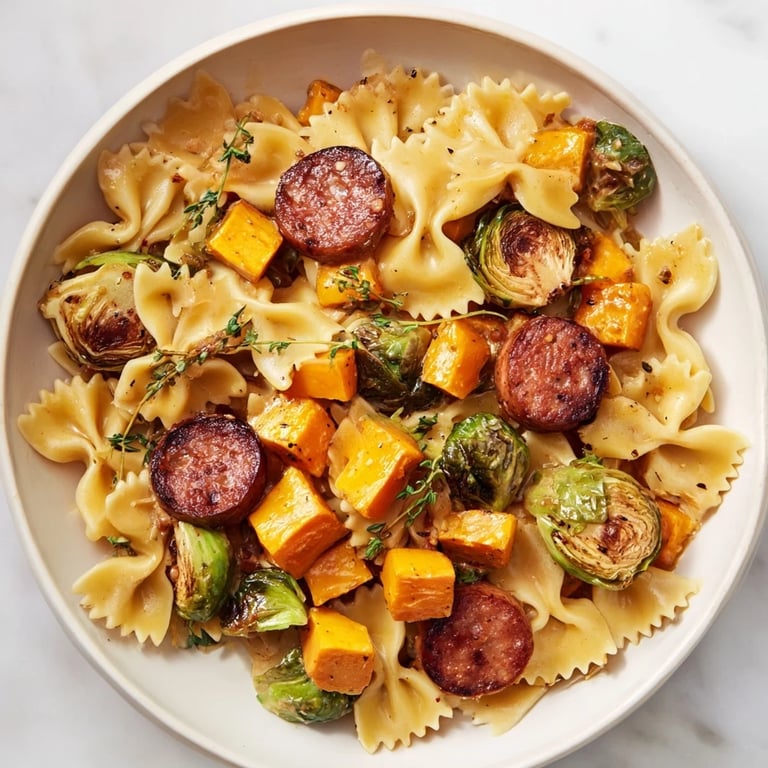 Pin A cozy, flavorful one-skillet meal featuring bow tie pasta tossed with smoked sausage, roasted butternut squash, and Brussels sprouts in a rich garlic butter sauce—a perfect celebration of fall's best ingredients.
