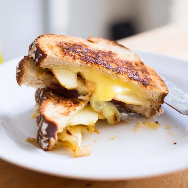 Pin A gourmet twist on the classic grilled cheese, featuring sweet caramelized onions, crisp apple slices, and sharp cheddar, all melted between golden, buttery bread.