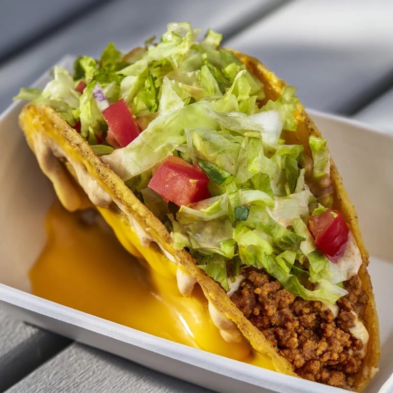 Pin A budget-friendly twist on the fast-food favorite, these tacos feature a soft cheesy flatbread wrapped around a crunchy taco shell filled with seasoned beef, lettuce, and zesty sauce.