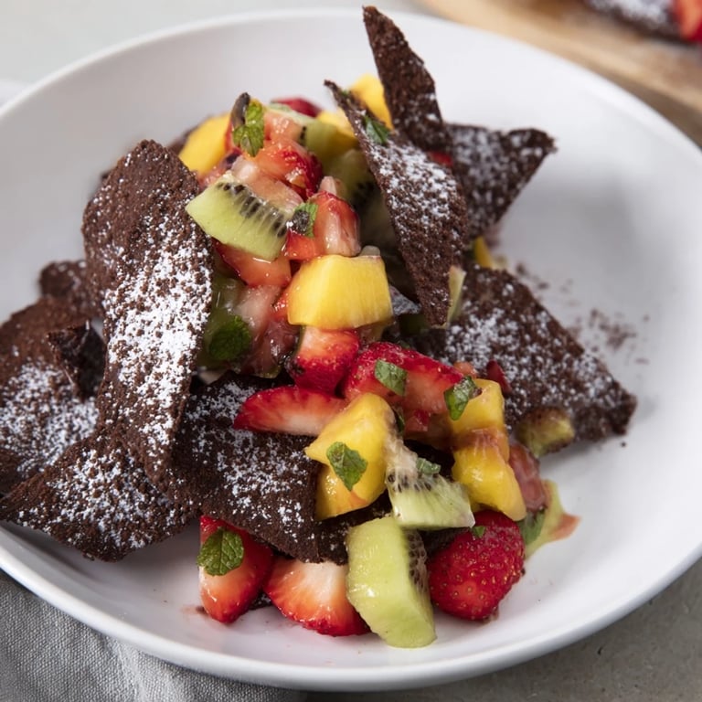 Pin A playful, sweet twist on the classic appetizer—crispy homemade chocolate tortilla chips served with a vibrant, refreshing fruit salsa. Perfect for parties or as an inventive finish to any meal.