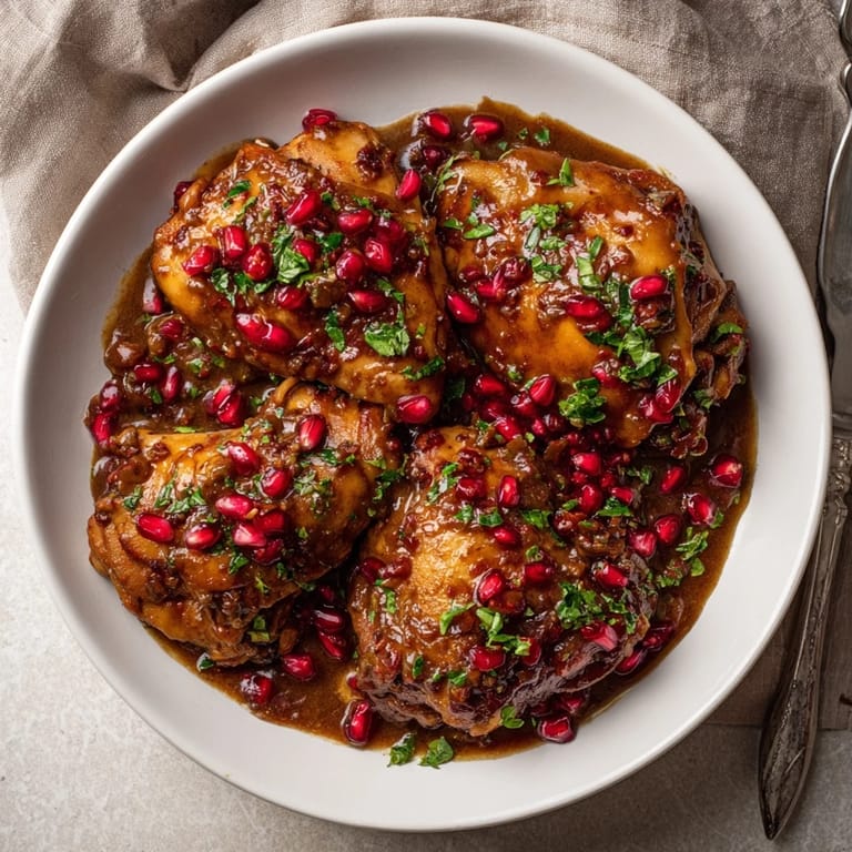 Pin A rich, tangy-sweet Persian stew featuring tender chicken thighs simmered in a luscious sauce of ground walnuts and pomegranate molasses. This affordable version maintains authentic flavor while being budget-friendly.