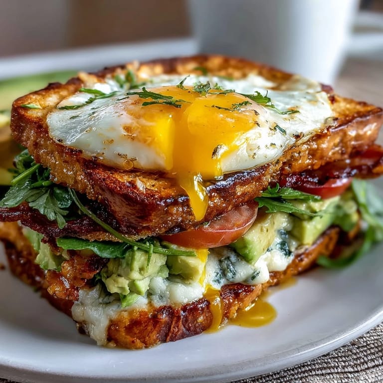 Pin This breakfast stack takes the classic BLT sandwich and elevates it with two breakfast staples - avocado and eggs. The crispy bacon provides a satisfying crunch and smoky flavor, while the creamy avocado brings richness and the runny egg creates a natural sauce that ties everything together. It's a perfect weekend treat that feels special without requiring complicated techniques.