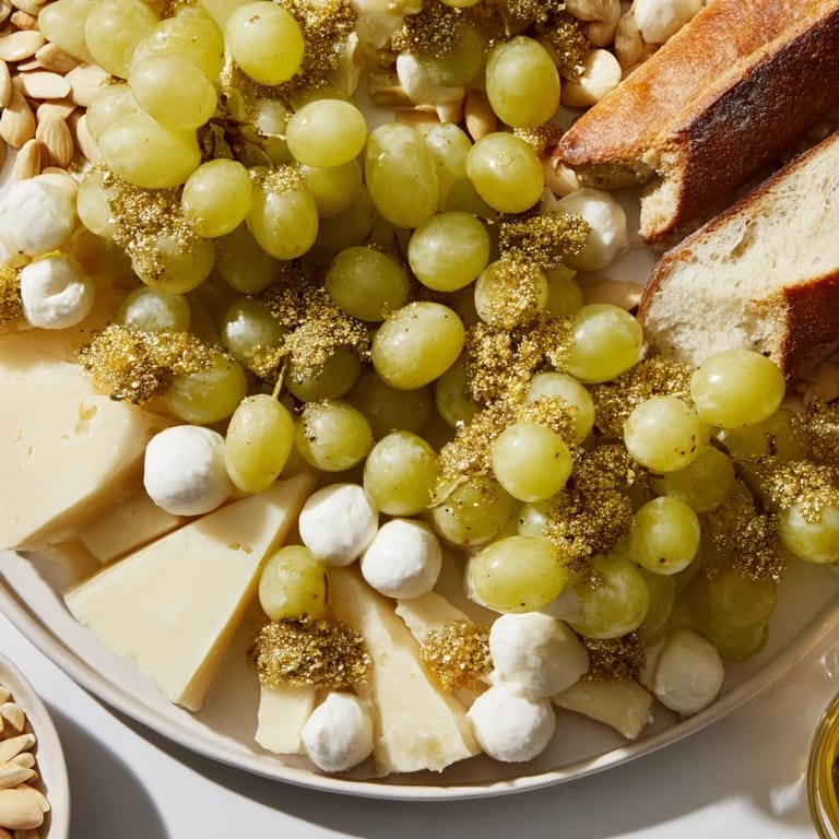 - Drain those prosecco grapes carefully in a colander, letting every drop fall away. While they're still slightly damp, immediately roll them on a plate of superfine sugar. Watch as they become frosted and sparkly, transforming before your eyes. Place them in the center of your cheese platter. Using a fine mesh sieve or a small food-safe brush, dust them lightly with edible gold dust. Less is more here—you want shimmer and sophistication, not costume jewelry.
