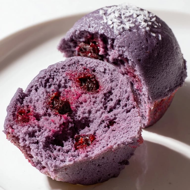 Pin Soft, chewy muffins with a vibrant purple hue, blending sweet ube and tart cranberries for a unique fusion treat. Perfect for breakfast or as a snack.